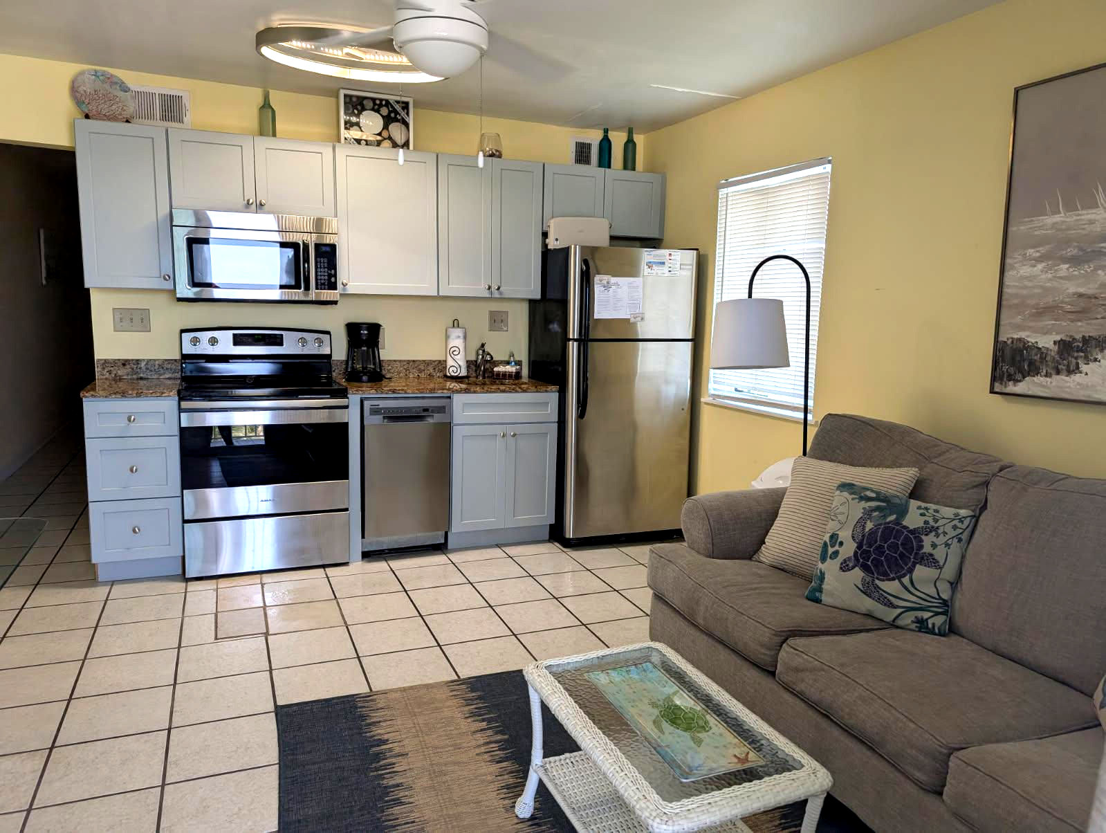 - Unit has a Queen sized bed and a Queen sized sleeper sofa in the living room and 1 lower wall bunk for a small child.